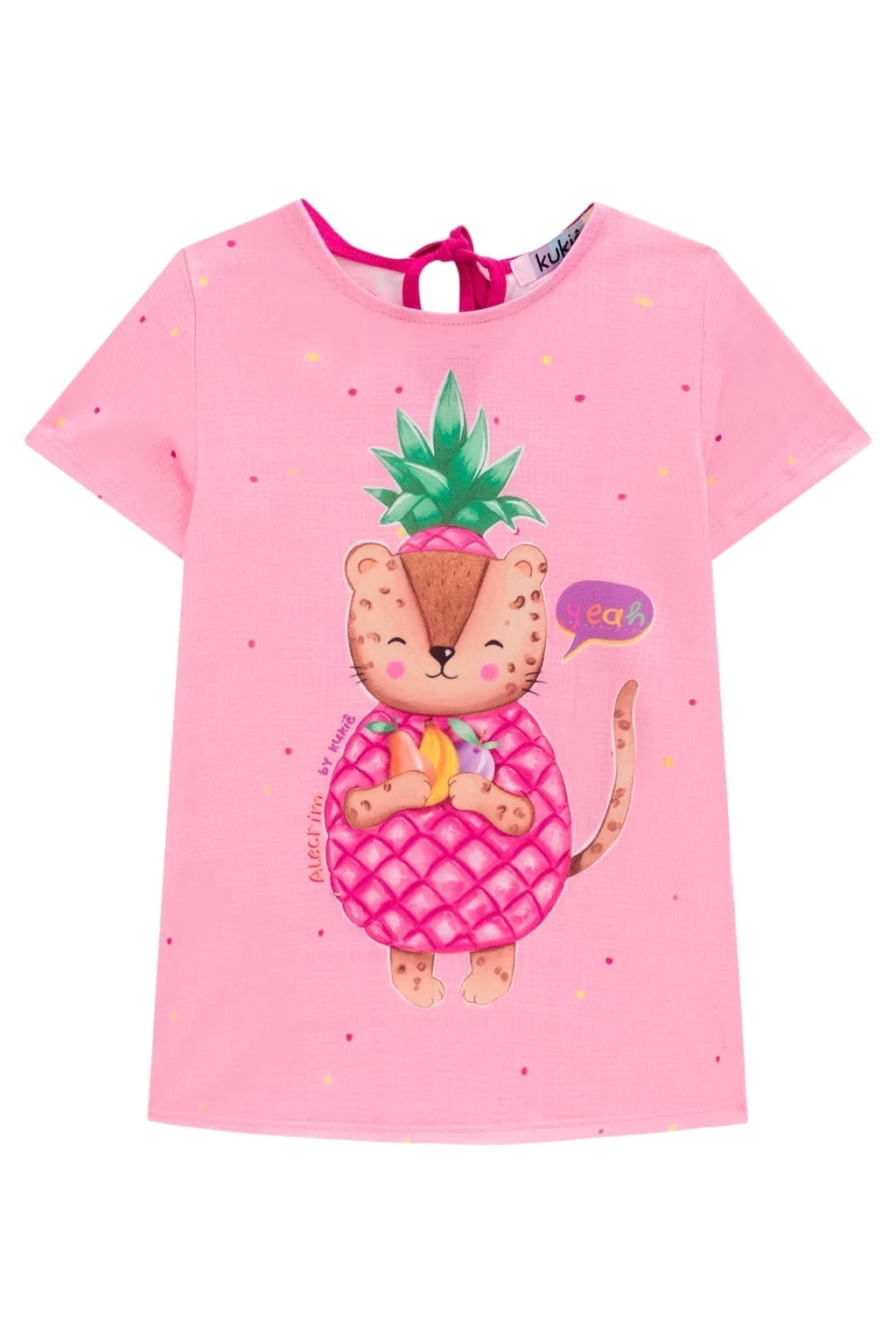 A estampa divertida de tigre e abacaxi deste vestido é uma celebração da natureza e da vida selvagem. Com detalhes intricados e cores vivas, criando uma experiência visual encantadora para suas pequenas aventureiras. Esta estampa única transforma o vestido em uma peça de moda que é ao mesmo tempo sofisticada e divertida.