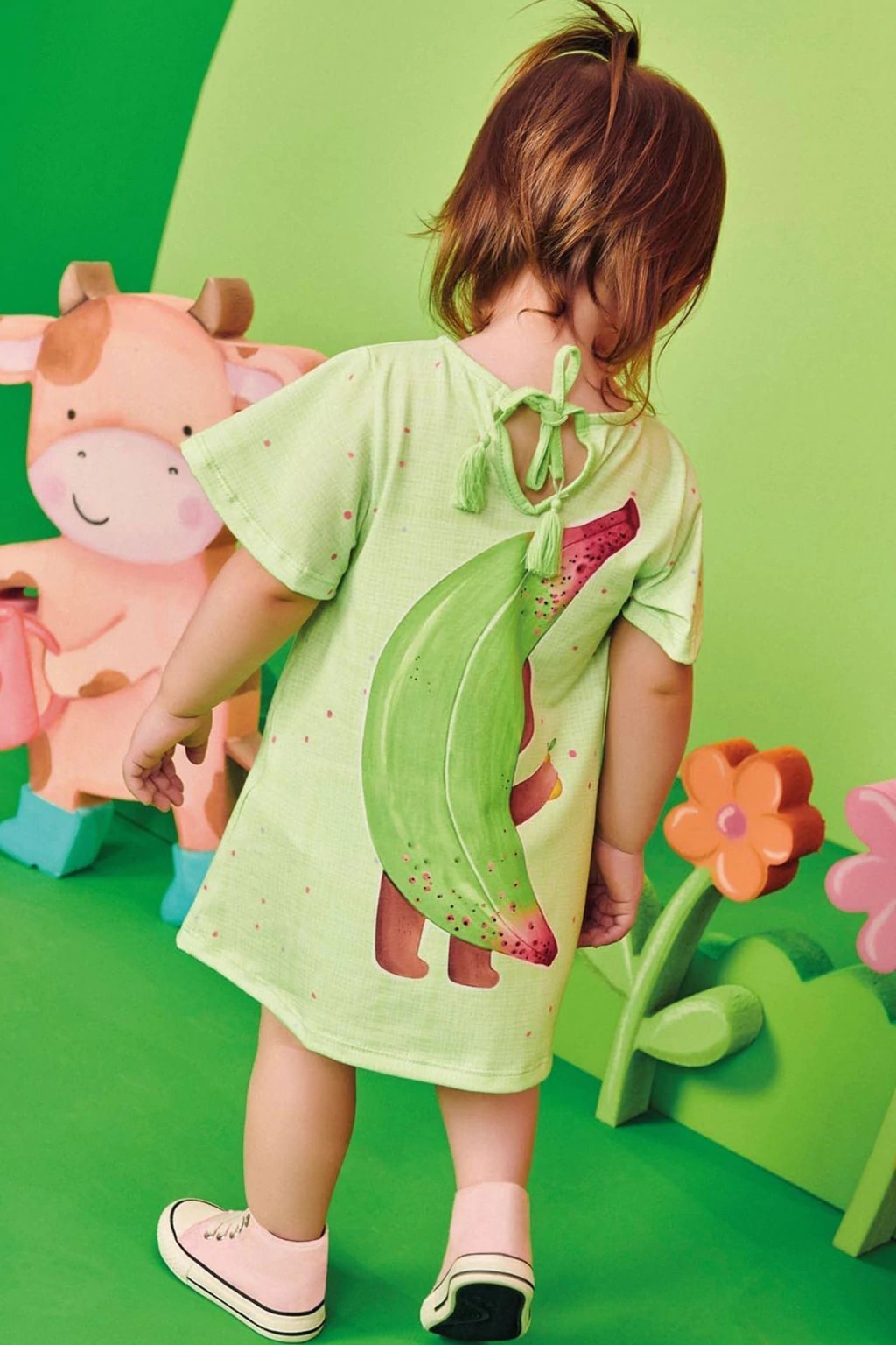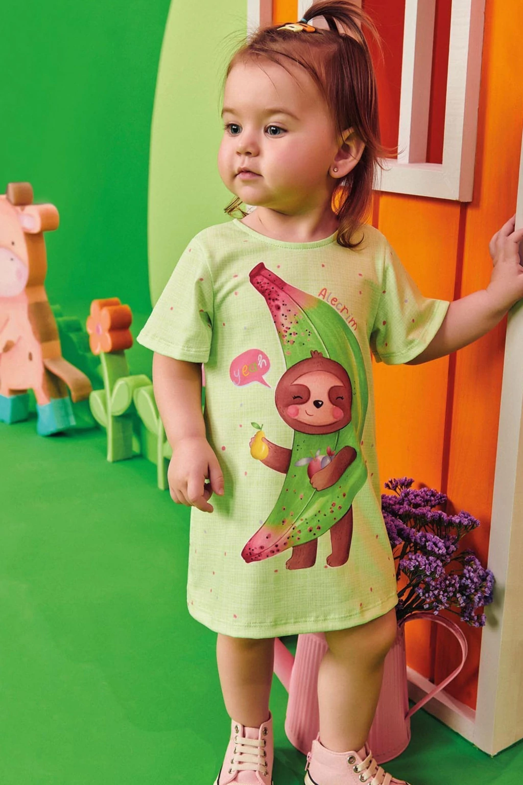 Além de ser uma peça de moda, este vestido é uma obra de arte. A combinação criativa de bichos-preguiça e bananas cria um visual único que é tanto divertido quanto elegante. Os detalhes cuidadosamente elaborados fazem deste vestido uma escolha encantadora para qualquer ocasião, desde festas de aniversário até aventuras no parque.